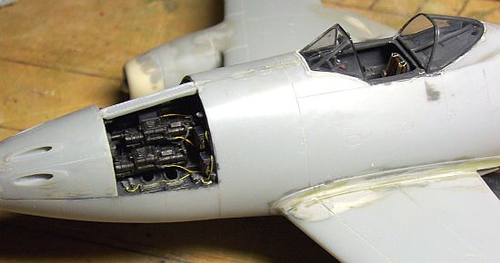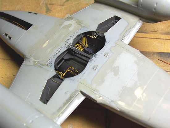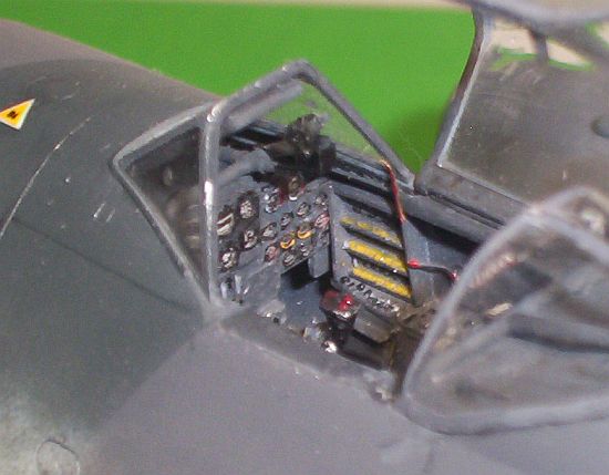 trupu, aby mi pri montáži nevznikla medzera medzi stenou trupu a bočnými pultami. Kokpit som doplnil plechmi od Eduarda a tiež